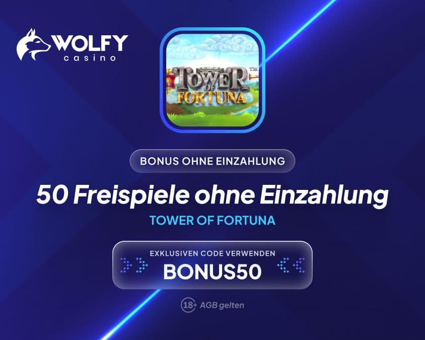 Wolfy Casino bietet einen exklusiven Bonus ohne Einzahlung in Form von 50 Free Spins für Tower of Fortuna. Dieser Operator Bonus ohne Einzahlung wird direkt nach Registrierung mit Code aktiviert.